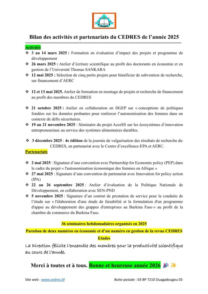 Développement Économique et Social 31 décembre 2025 Idrissa OUIMINGA CEDRES BILAN 2025 1 décembre 2025 Idrissa OUIMINGA 4e journée vulgarisation des résultats de recherche Read more 22 octobre 2025 Idrissa OUIMINGA Participation du CEDRES à Evidence 2025 à Cotonou Read more 24 septembre 2025 Idrissa OUIMINGA Ecriture du nouveau projet scientifique du dP-ASAP 23 au 25 septembre 2025 Read more 29 mai 2025 Idrissa OUIMINGA Signature protocole d’accord CEDRES – IPA Read more 26 mai 2025 Idrissa OUIMINGA Renforcement des capacités en montage des projets et recherche de financement Read more 27 mars 2025 Idrissa OUIMINGA Formation des doctorants en écriture scientifique Read more Previous Post 4e journée vulgarisation des résultats de recherche